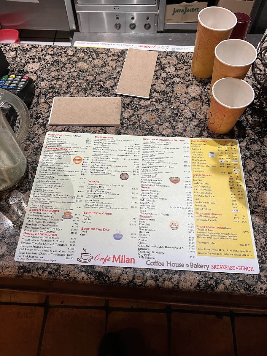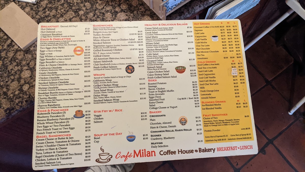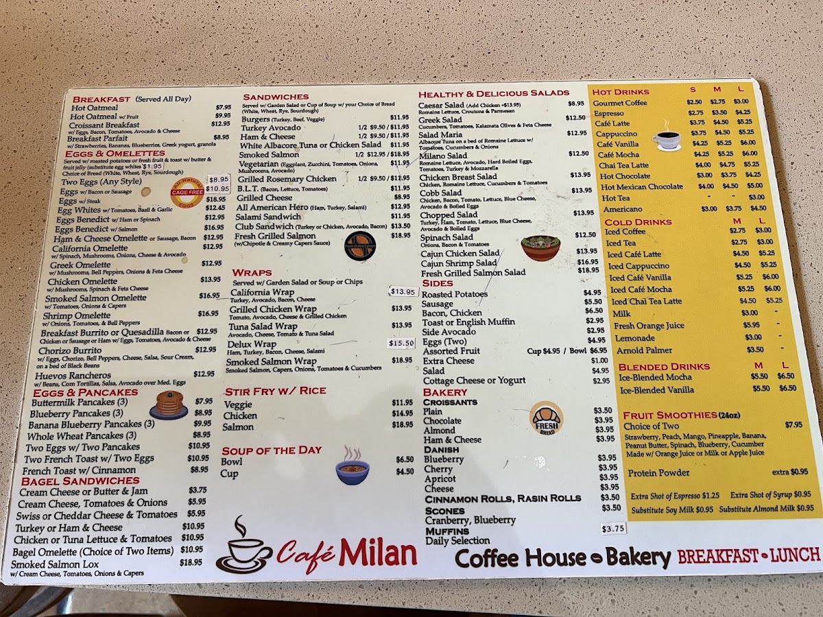 Cafe Milan in Playa Del Rey offers a delightful menu, perfect for any time of day. For breakfast, their Buttermilk Pancakes and Blueberry Pancakes are a great choice, both offering a classic and comforting start to the morning. The bagel sandwiches are a great option for a lighter yet satisfying meal, with choices like a Bagel with Cream Cheese and a Bagel with Butter & Jam. The restaurant also caters to health-conscious diners with fresh and flavorful salads, including the classic Caesar Salad and the heartier Roasted Chicken Caesar. If you're in the mood for something a bit more substantial, their stir-fry dishes, such as Chicken Stir Fry with Rice and Salmon Stir Fry with Rice, are both savory and filling. To satisfy a sweet craving, Cafe Milan offers delicious baked goods, including a warm Scone and a freshly baked Muffin, rounding off a menu that is both diverse and delicious. Whether you're after a hearty meal or something light and refreshing, this restaurant provides plenty of options to suit all tastes.
